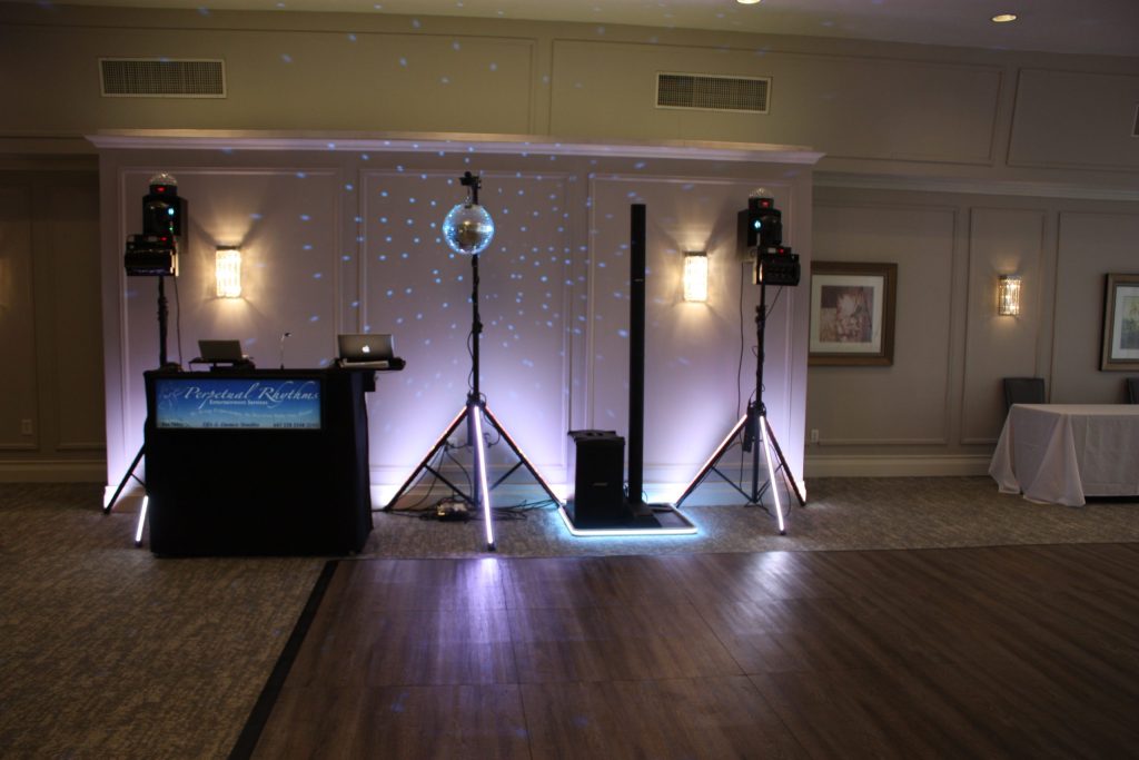 DJ Lighting is Aimed at the Dance Floor, ceiling or back wall, not into your guests’ eyes at the dinner tables.